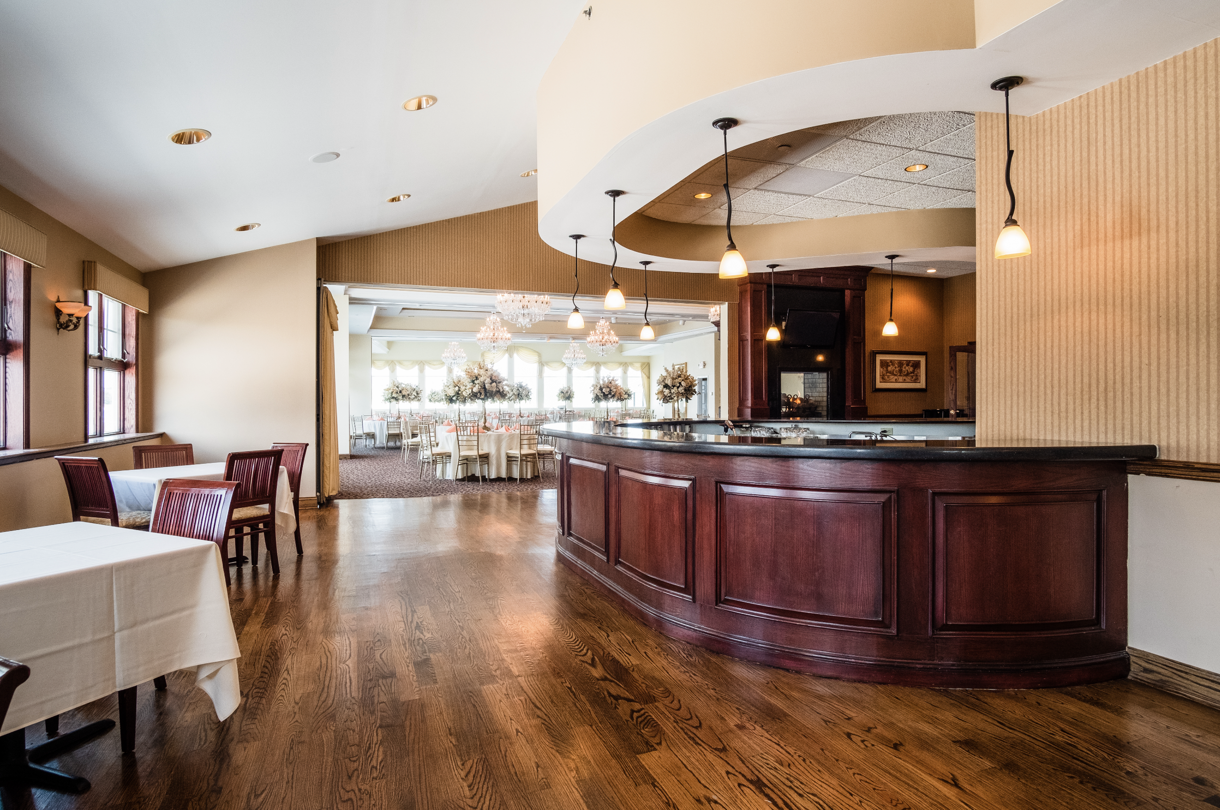 The Fireplace Room is a warm and cozy space with double-sided fireplace, 18 foot vaulted ceilings, elegant chandeliers and large statement bar area. The space includes superior service, table seating with chiavari chairs and fresh linens. Perfect for intimate celebrations, engagements, rehearsals, retirements, birthdays, corporate events, holiday parties and cocktail hours.